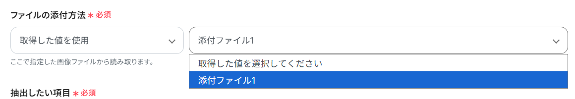- 次に、オペレーションでOCR機能の「任意の画像やPDFを読み取る」アクションを設定し、メールに添付されたファイルからテキスト情報を抽出します