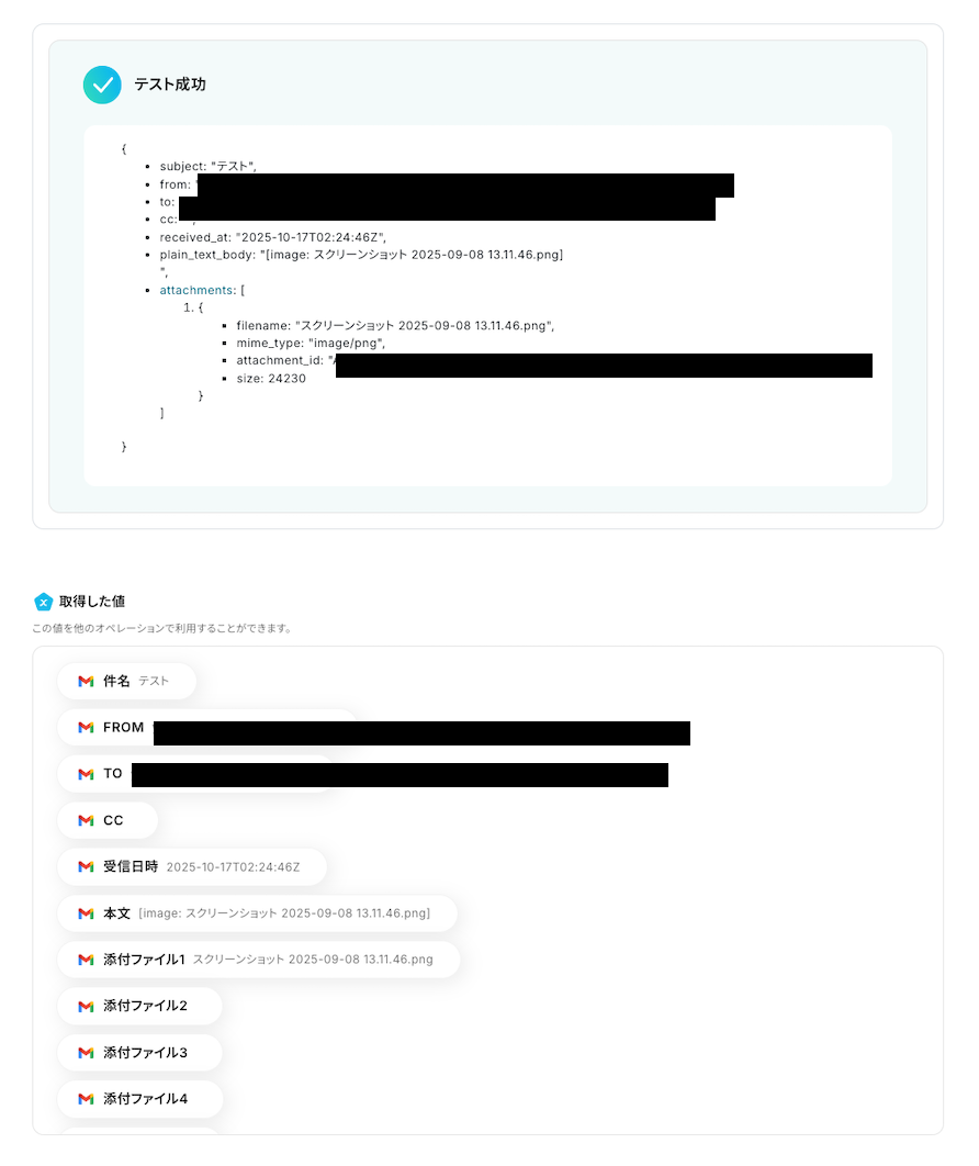 テストが成功すると、以下の画像のような取得した値が表示されます。