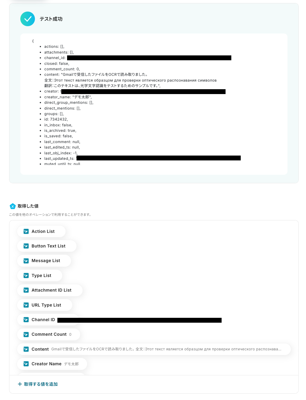 - Twistへの投稿設定では、投稿先のチャンネルIDやスレッドのタイトル、本文などを任意の内容やOCR機能で取得した値を用いて設定してください