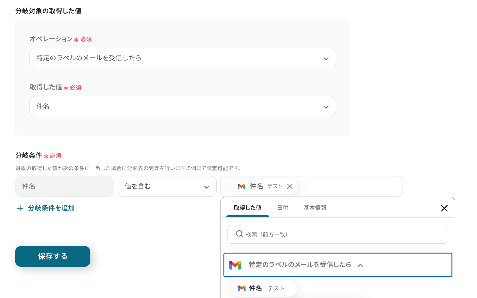 オペレーションに「特定のラベルのメールを受信したら」、取得した値に検知したい項目を設定します。
