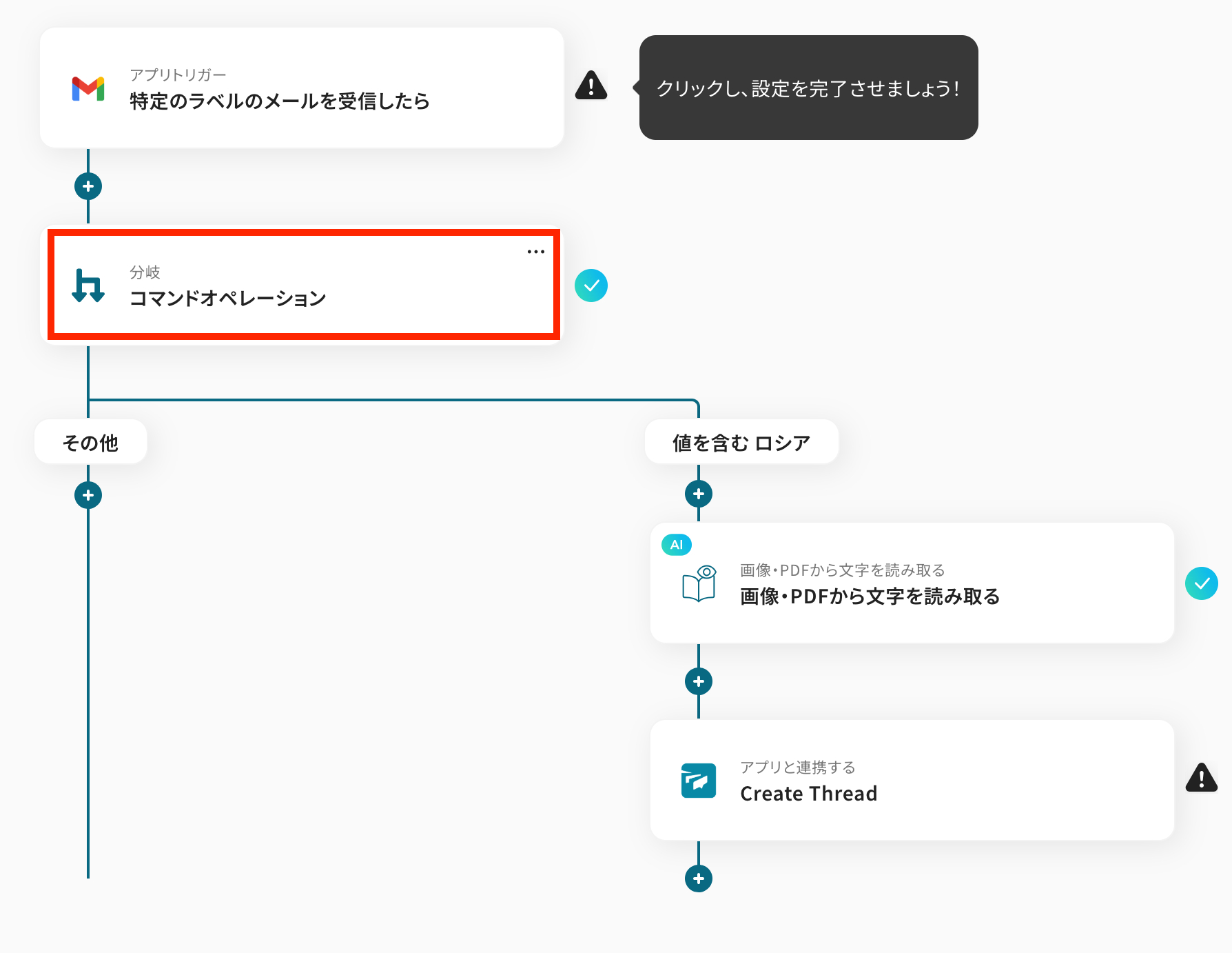 ※「分岐する」オペレーションは、ミニプラン以上でご利用いただけます。フリープランで利用するとエラーになってしまうのでご注意ください。