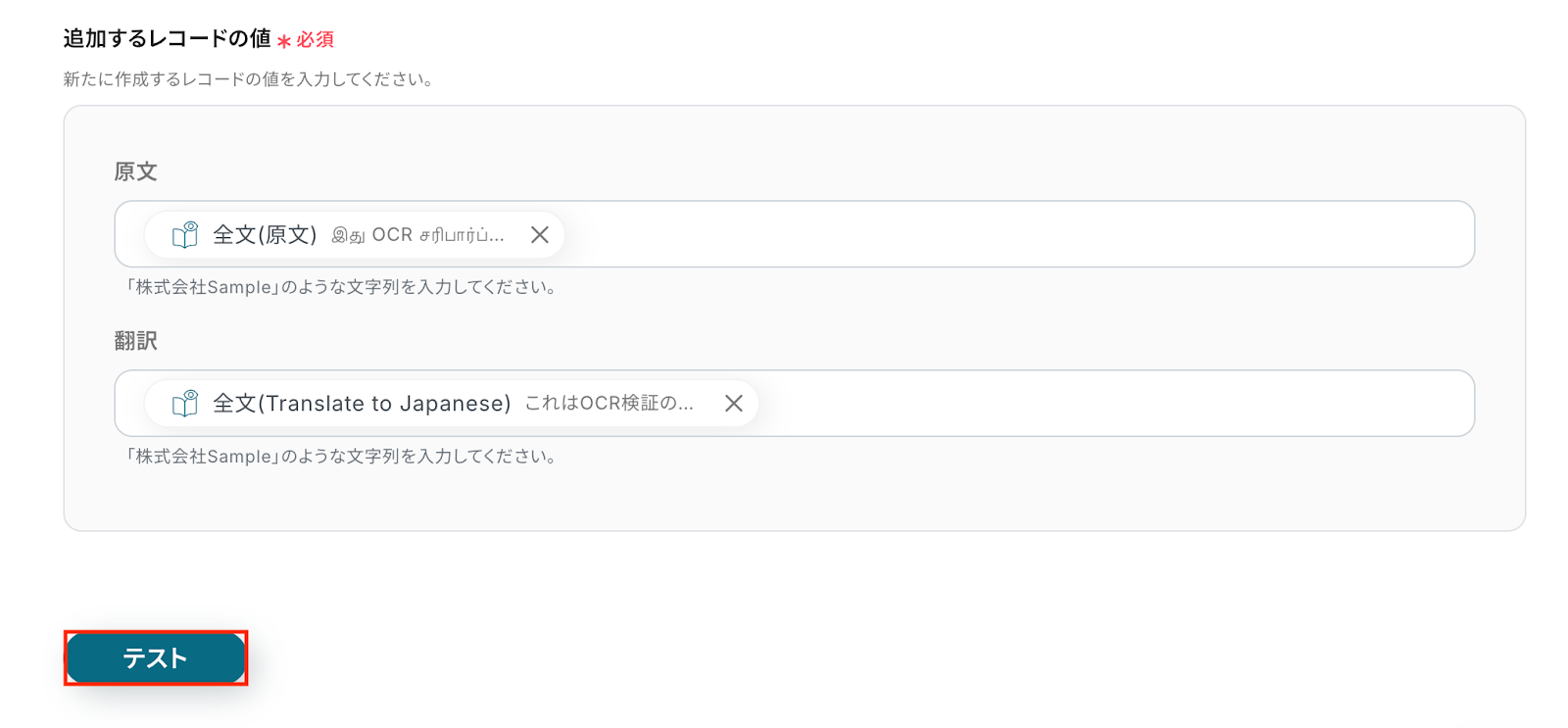 入力が完了したら「テスト」をクリックして、設定した内容でNotionにレコードが追加されるか確認しましょう。