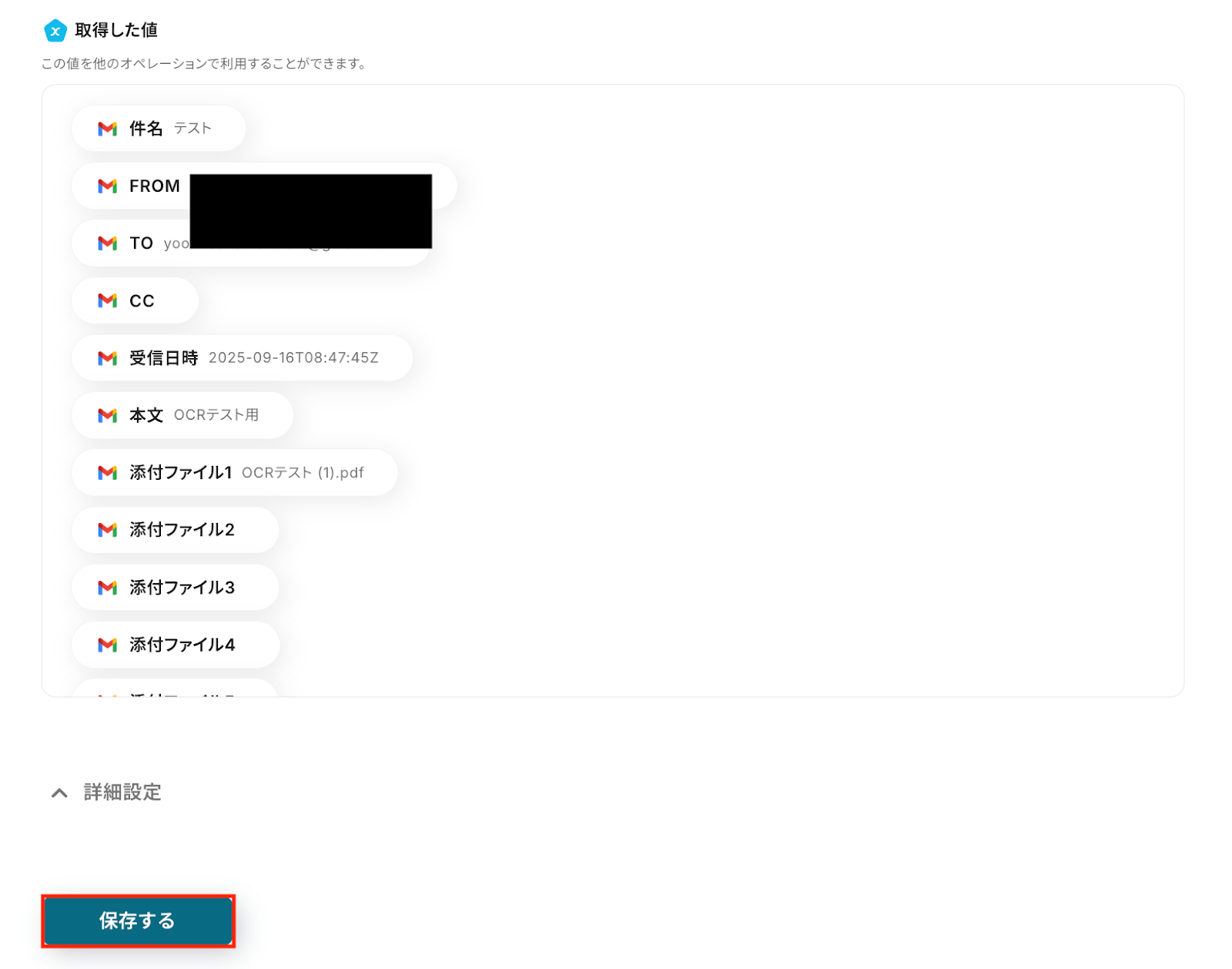 入力が完了したら、設定内容とトリガーの動作を確認するため「テスト」をクリック。 テストに成功すると、Gmailで受信した特定ラベルのメールに関する情報が一覧で表示されます。