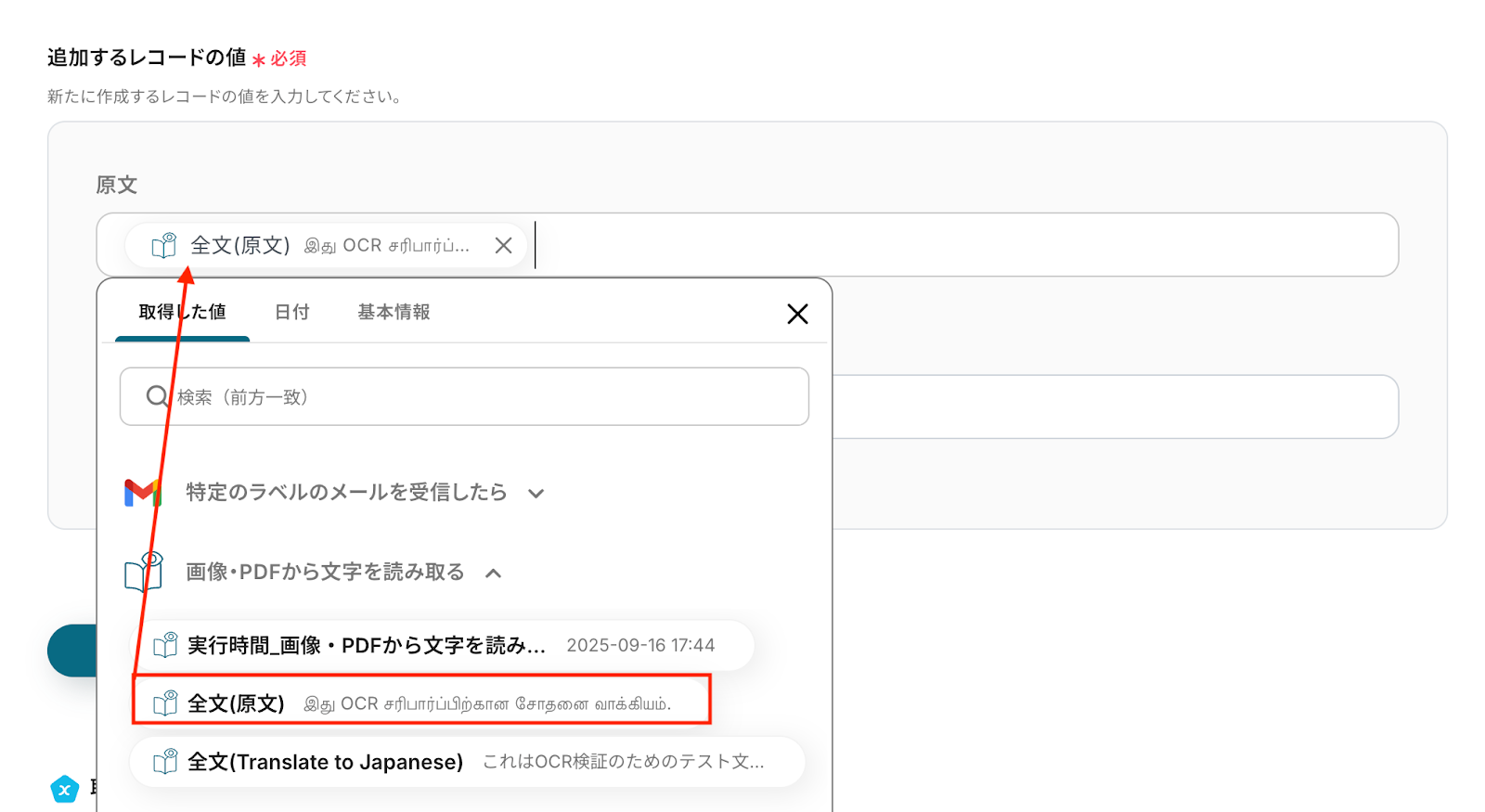 追加するレコードの値 入力欄をクリックすると前のステップ(OCR機能で文字の読み取り)で取得した値が表示されるので、その中から対応する項目を各フィールドに割り当てましょう。 取得した値を活用することで、値が固定化されずに毎回最新の情報を反映 できます。 なお、テキストを直接入力した部分は固定値とされるため、取得した値を活用せず設定を行うと毎回同じ内容のレコードがNotionに追加されてしまうので注意 が必要です。