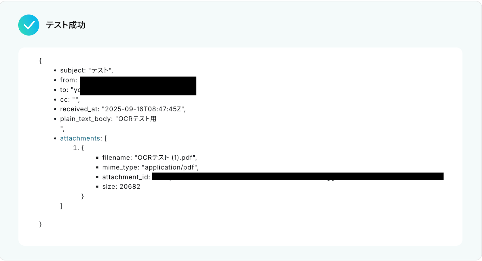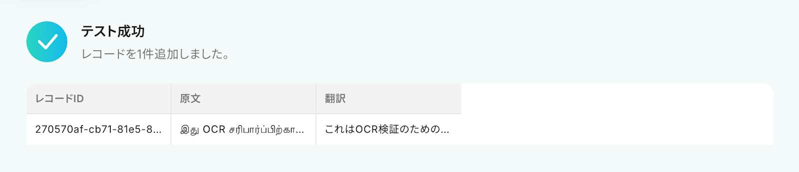 テストに成功すると、AIによって添付ファイルから読み取り・翻訳された情報が一覧で表示されます。