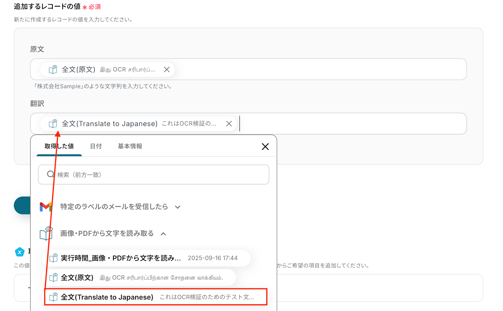 抽出したい項目 今回はメールの添付ファイルからタミル語の原文とその翻訳結果(日本語)を抽出し、Notionにレコードとして追加したいので、デフォルトで設定されている項目をそのまま設定しました。