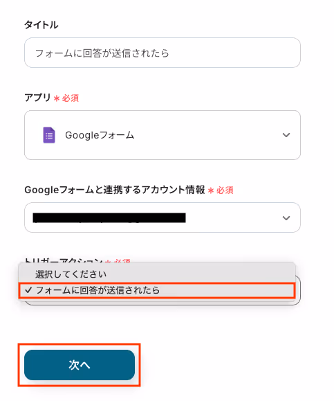 続いて、連携アカウントとアクションを選択に進みます。各項目の確認・入力をし、次に進みましょう!