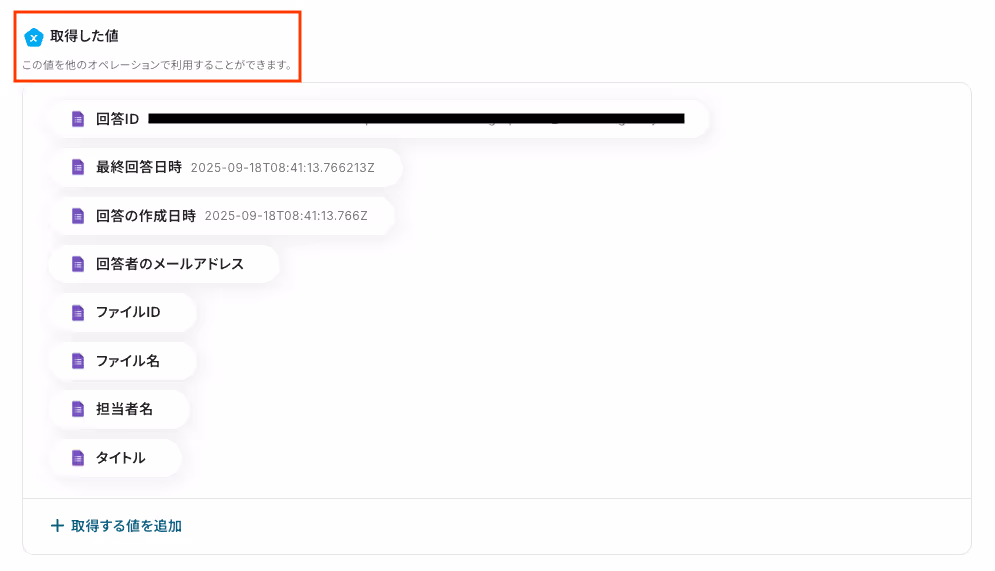 取得する値に回答項目を追加後、「保存する」をクリックしましょう。
