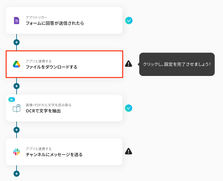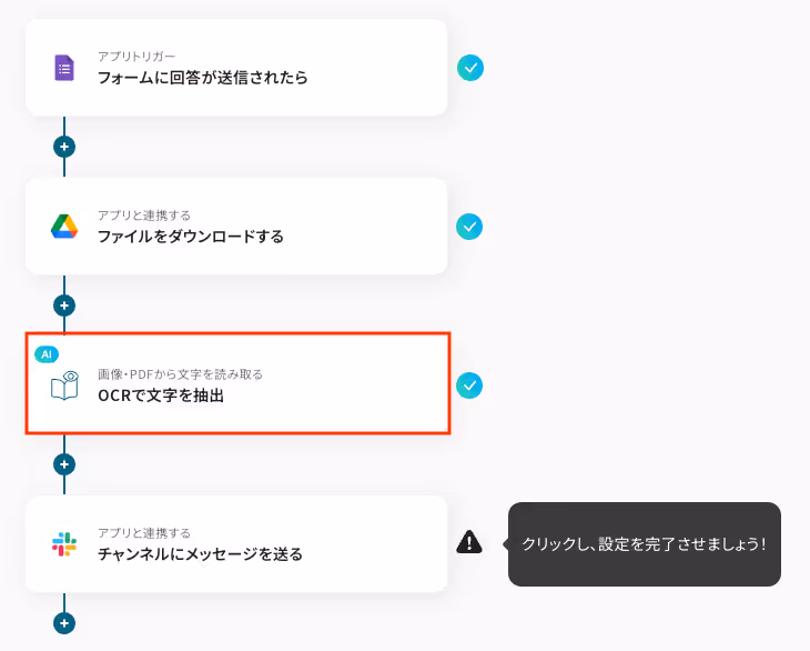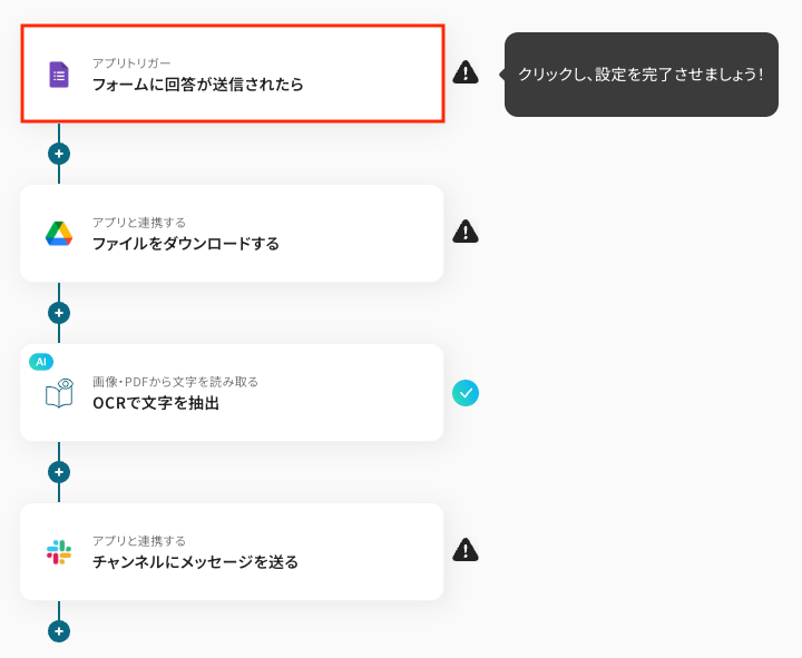 それではここから代表的な例として、Googleフォームに写真が送信されたら、OCR機能でテキストを読み取り、その内容をSlackに自動で通知するフローを解説していきます!