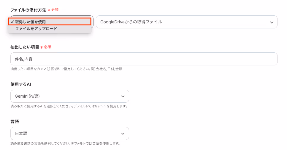 A:はい、可能です。「OCRで文字を抽出」の設定で、例えば名刺の「会社名」やレシートの「合計金額」などを、「抽出したい項目」に指定いただくと、画像から特定の項目だけを抜き出して通知できます。