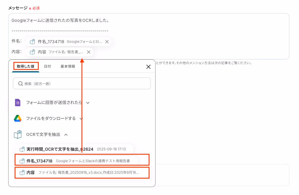 「メッセージ」は取得した値から選択し、必要に応じて任意のテキストを手動で入力してください。