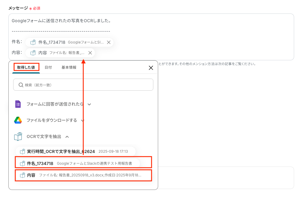 「メッセージ」は取得した値から選択し、必要に応じて任意のテキストを手動で入力してください。 ※取得した値を使用することで、毎回最新のファイル情報を通知することが可能です。