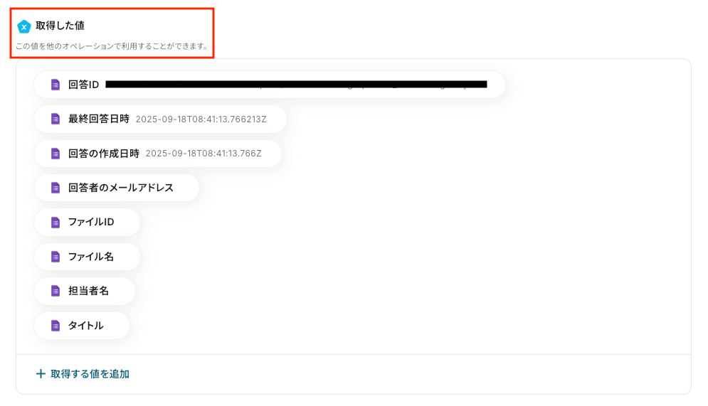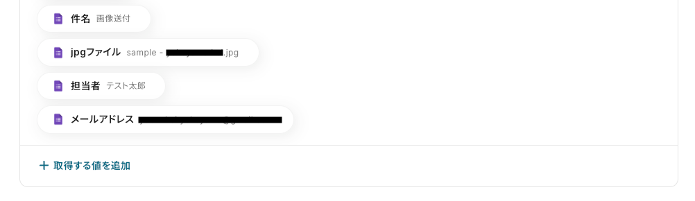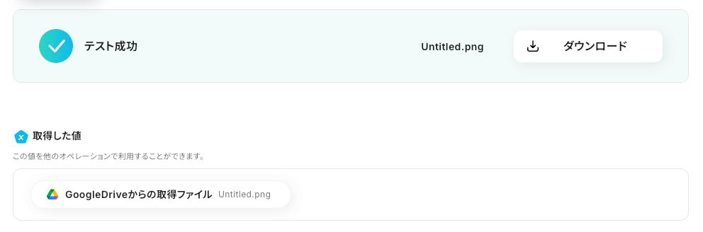 テストが成功すると、以下のように「取得した値 」が表示されます。 ※「取得した値」は、後のフローで使用します。