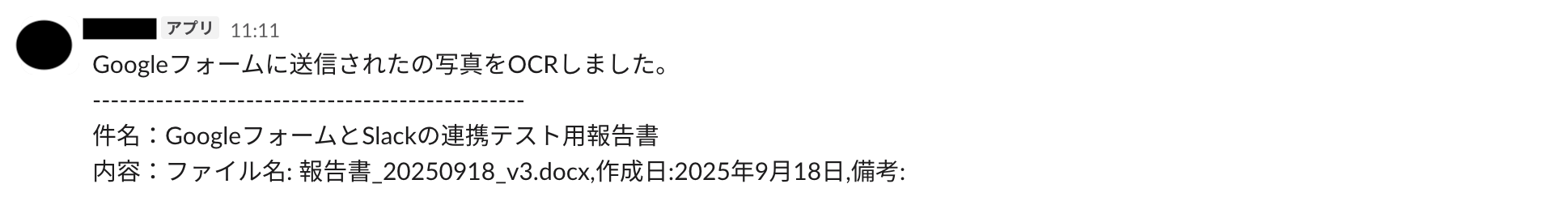 Googleフォームに投稿された写真から自動で文字を読み取り、その内容をチャットツールに通知する ことで、アンケートの回収や写真での報告業務などを効率化し、スムーズな情報共有を実現します!
