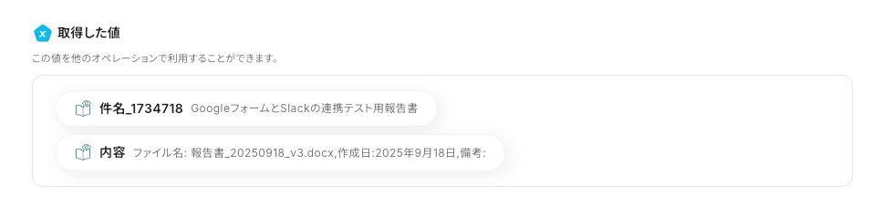 なお、デフォルトで取得した値には仕様上、Googleフォームの回答項目(担当者名など)が含まれません。 回答内容を取得するには、JSONPathを用いてアウトプットを追加する必要があるため、Googleフォームトリガーで、回答内容を取得する方法 を参考にしながら、追加作業を進めてください。