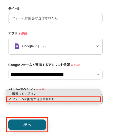 トリガーアクション:「フォームに回答が送信されたら」を選択