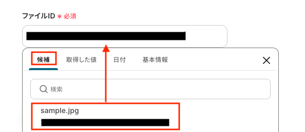 次に、API接続設定 です。 「ファイルID」を候補から選択します。