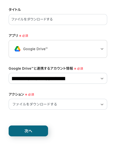 続いて、連携アカウントとアクションを選択 に進みます。各項目を確認し、「次へ」をクリックしましょう。