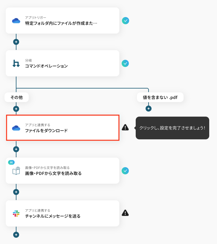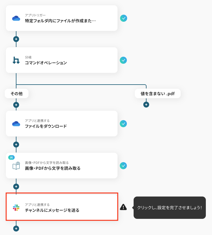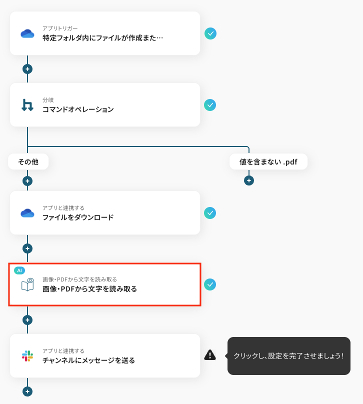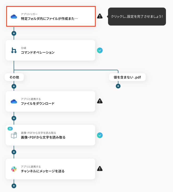 OneDriveなどのストレージサービスにPDFファイルが格納されたら、OCR機能で自動的にテキストを抽出し、Slackなどのチャットツールに通知することが可能です。
