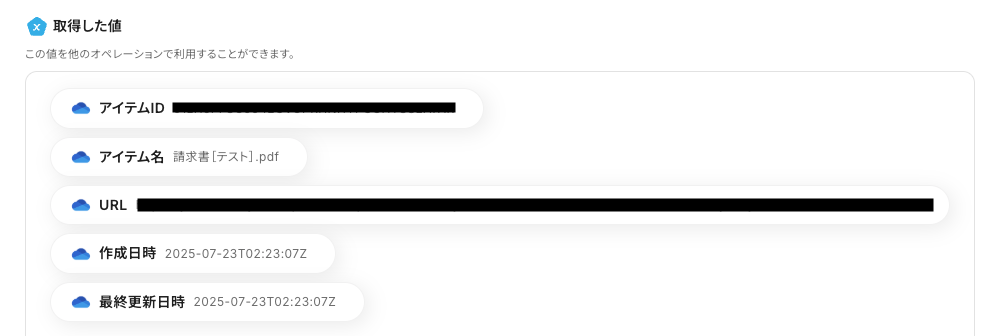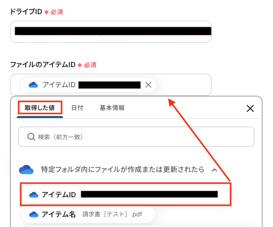 以下の画像を参考に、「ドライブID」「ファイルのアイテムID」を設定します。