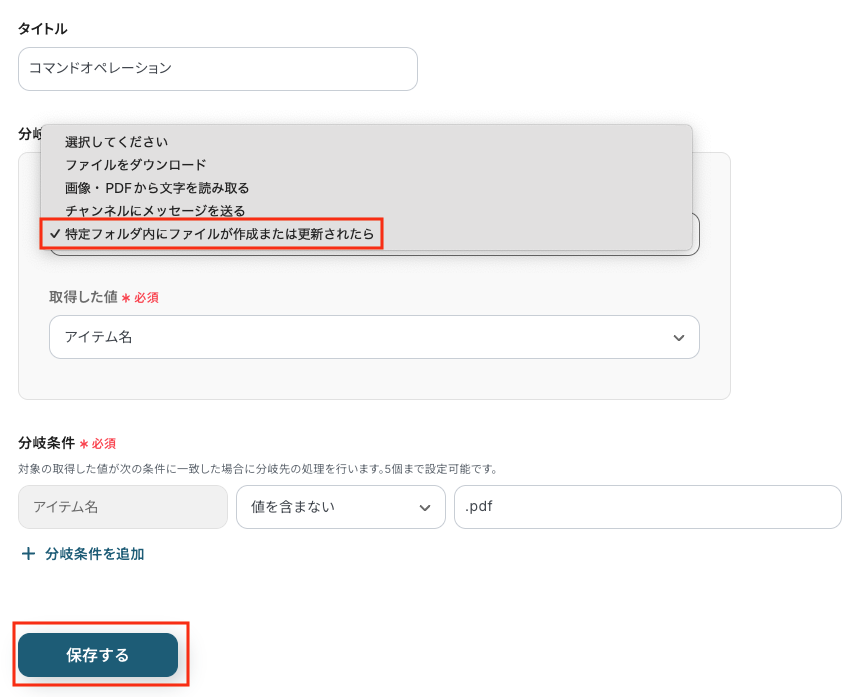 分岐機能を設定し、ファイルの作成・更新といった条件に応じて後続の処理を分岐させます。