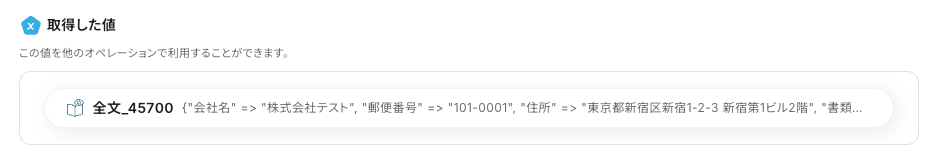 テストが成功すると、以下のように「取得した値」が表示されます。