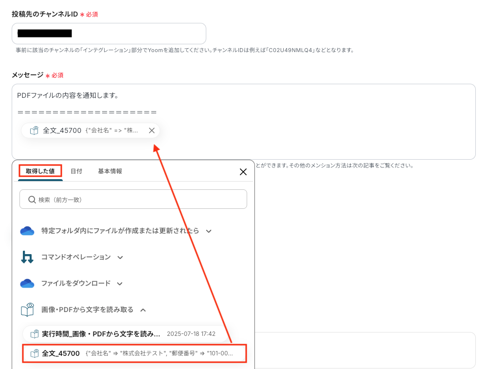 以下の画像を参考に、「投稿先のチャンネルID」「メッセージ」を設定します。