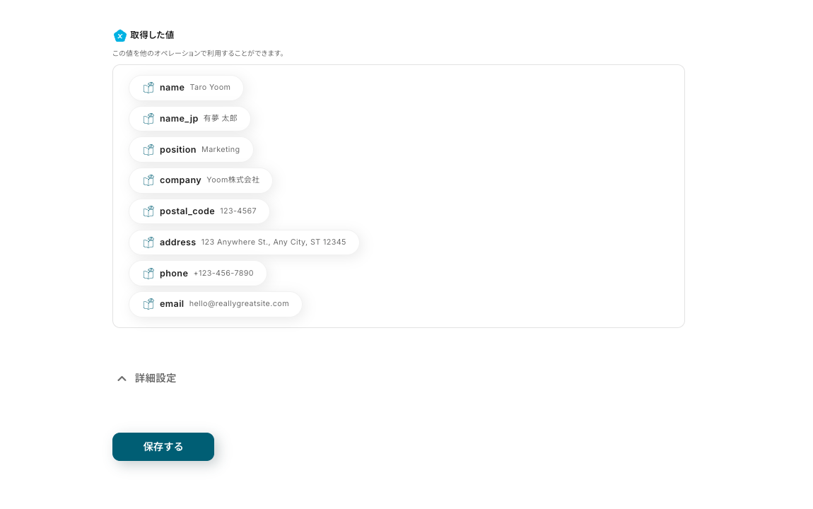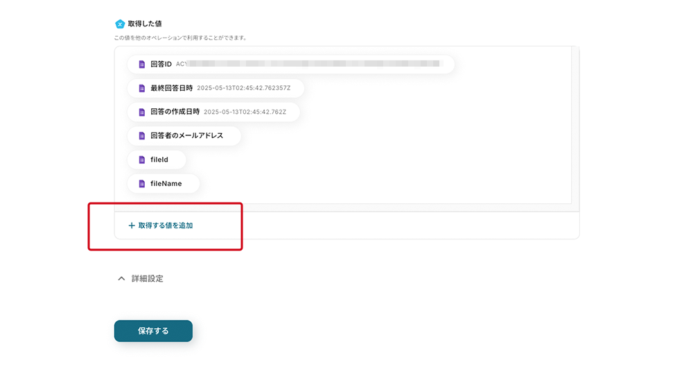 この項目・値を次の工程でGoogle スプレッドシートに追加していきます。