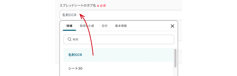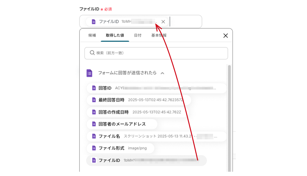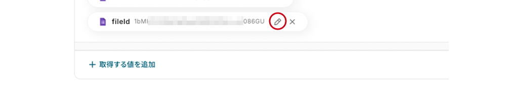 編集欄をクリックすると、プルダウンメニューが表示されます。取得した値タブから、前の工程で取得した項目と値が確認できます。