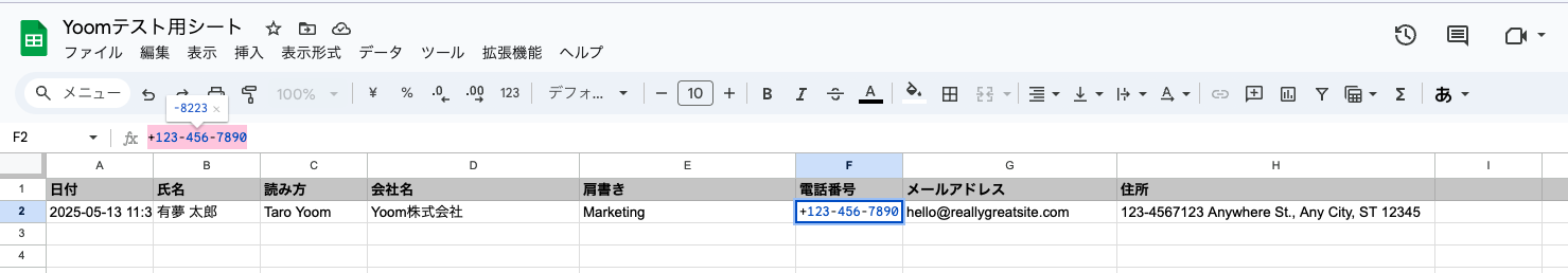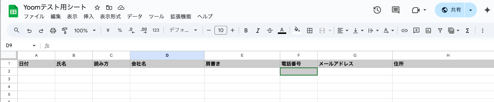 事前に準備したシートでは、名刺に標準的に掲載してある項目をヘッダに設定しました。
