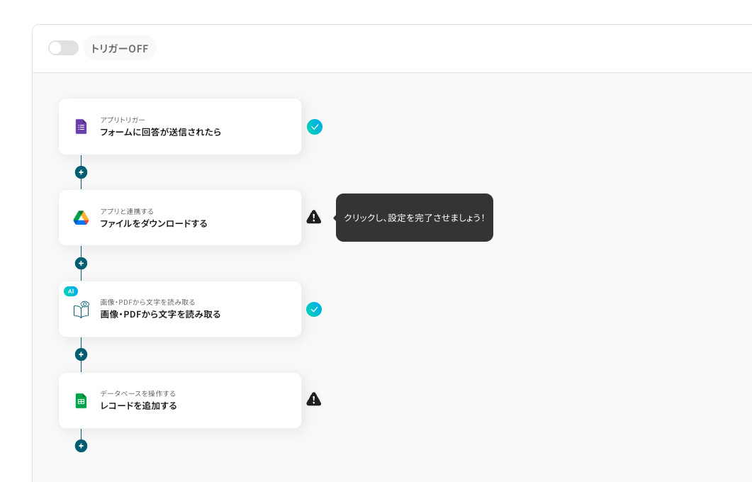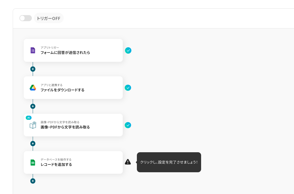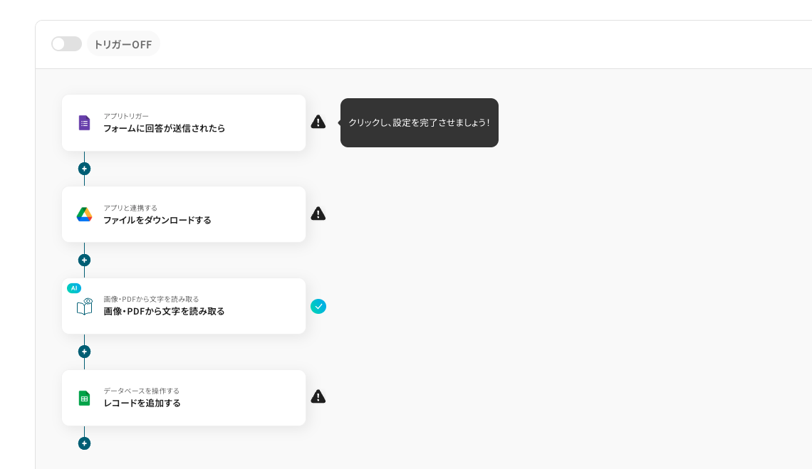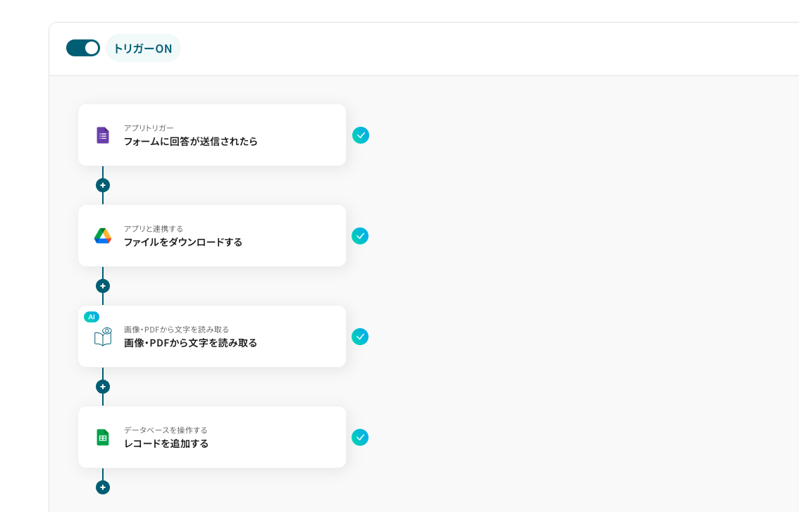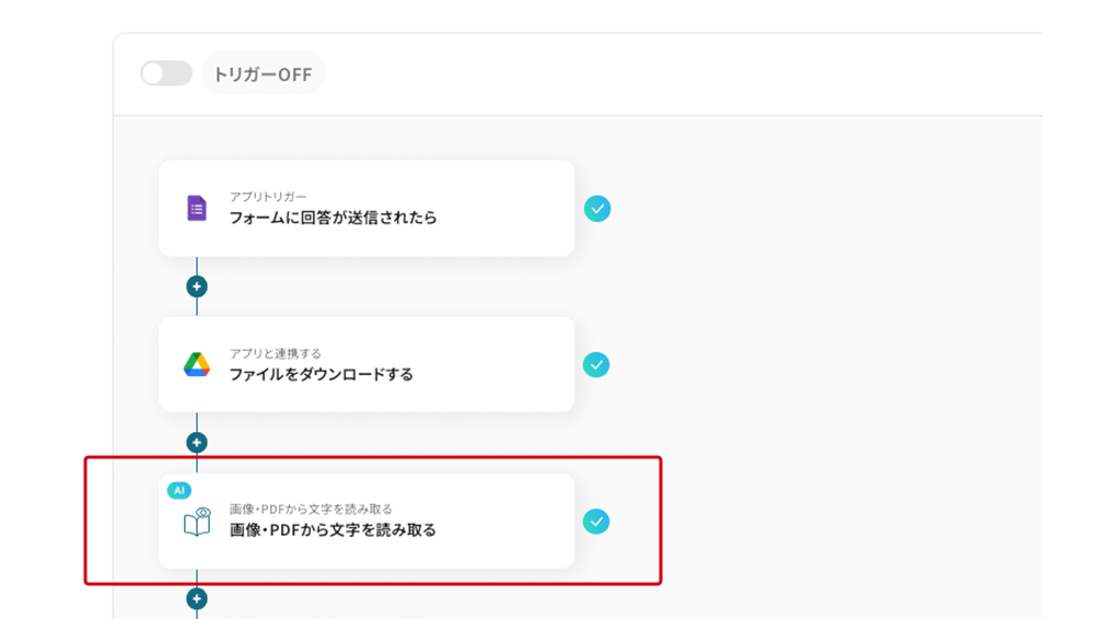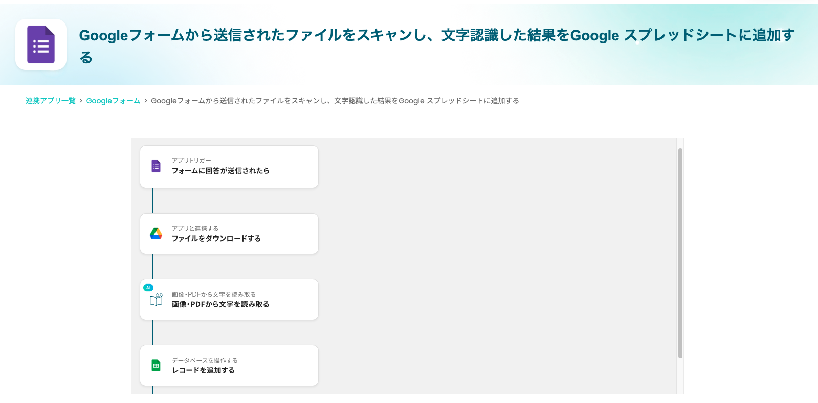 それではここから代表的な例として、Googleフォームで送信されたファイルから文字情報を自動で抽出し、その結果をGoogle スプレッドシートに記録するフローを解説していきます!