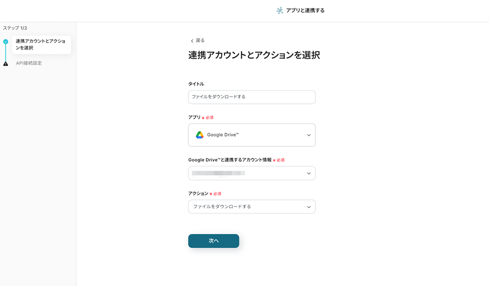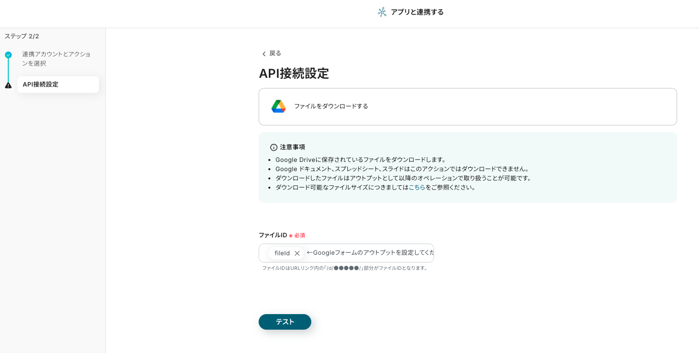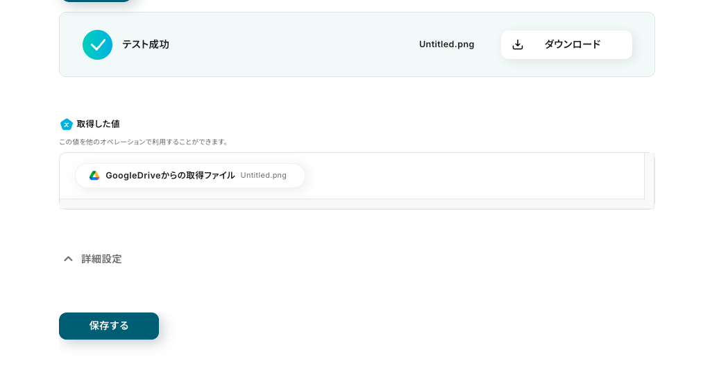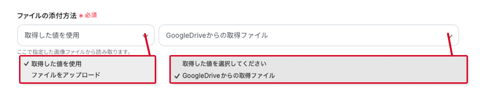 - 事前設定で、取得した値とGoogle Driveから取得したファイルが選択されているため、追加の操作は不要です。ちなみに、選択肢には以下の項目があります。