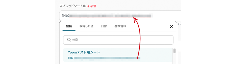 - 編集欄をクリックすると、プルダウンメニューが表示され、連携したアカウントに権限があるシートが候補として表示されます。選択すると、IDを引用できます。
