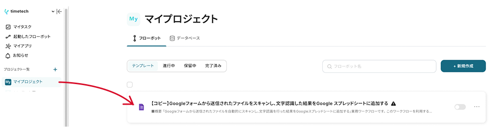 コピーしたテンプレートは、マイプロジェクトに追加されます。マイプロジェクトは左のメニューバーからアクセス可能です。