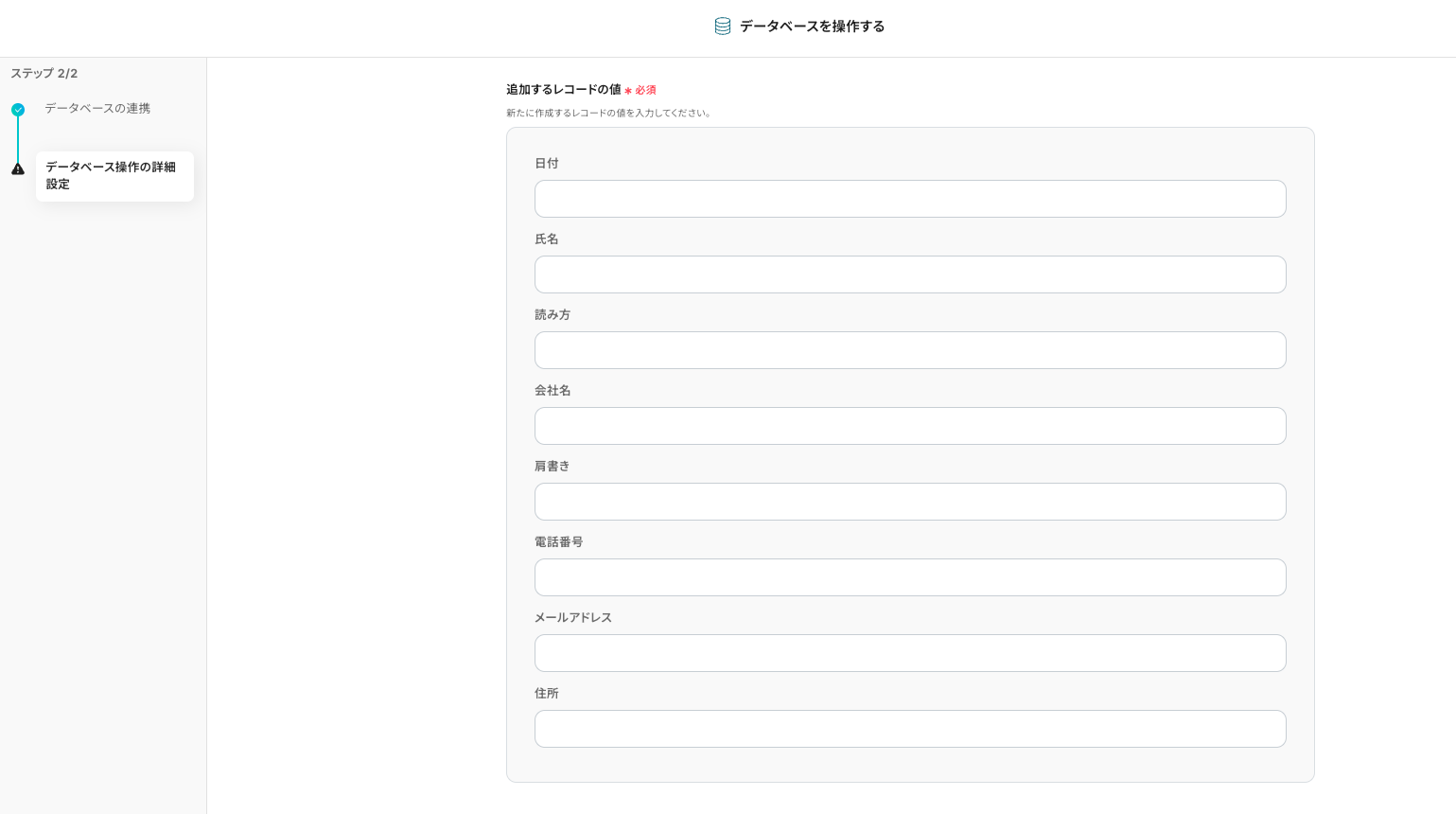 前の画面で指定したスプレッドシートの情報を読み込むと、ヘッダに設定した項目と編集欄が表示されます。