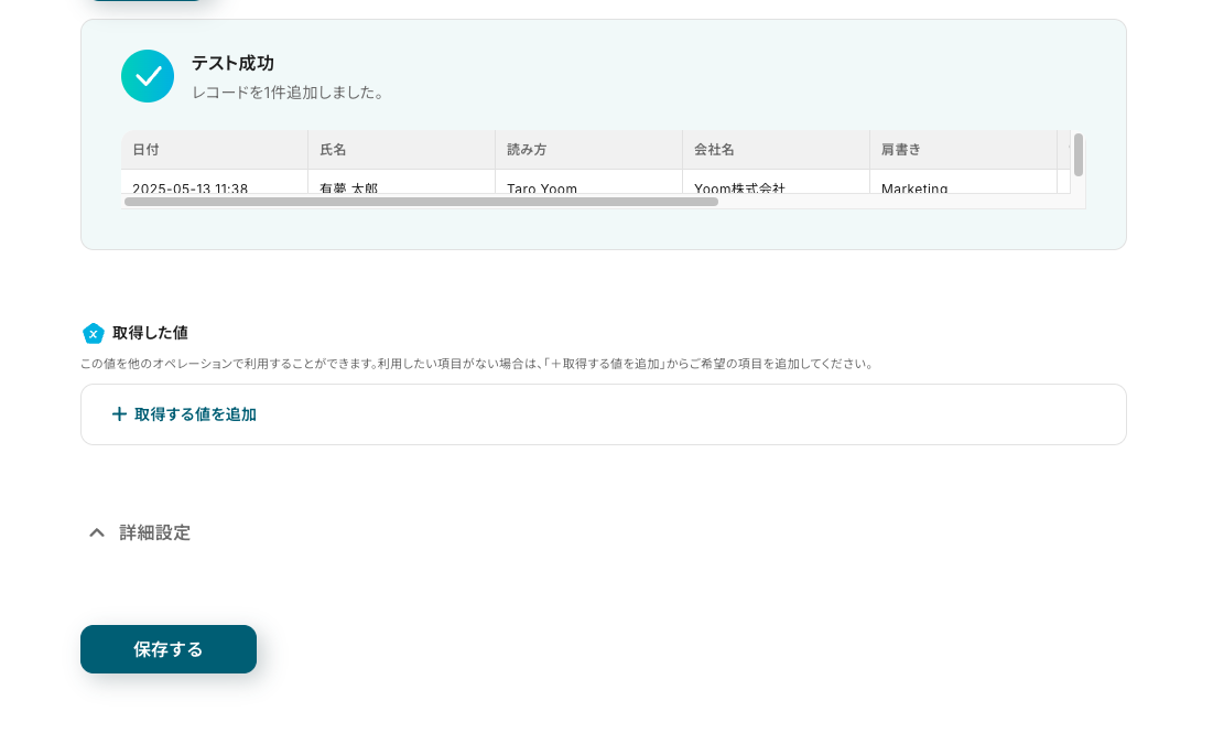 これでGoogle スプレッドシートのマイアプリ連携が完了です。