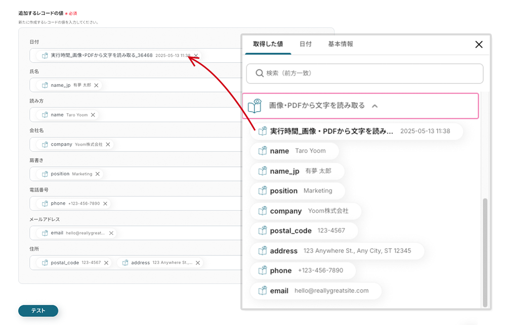 該当する値を選択すると、編集欄に引用コードが埋め込まれるので、全ての枠に値の紐付けができたらテストボタンをクリックしましょう。
