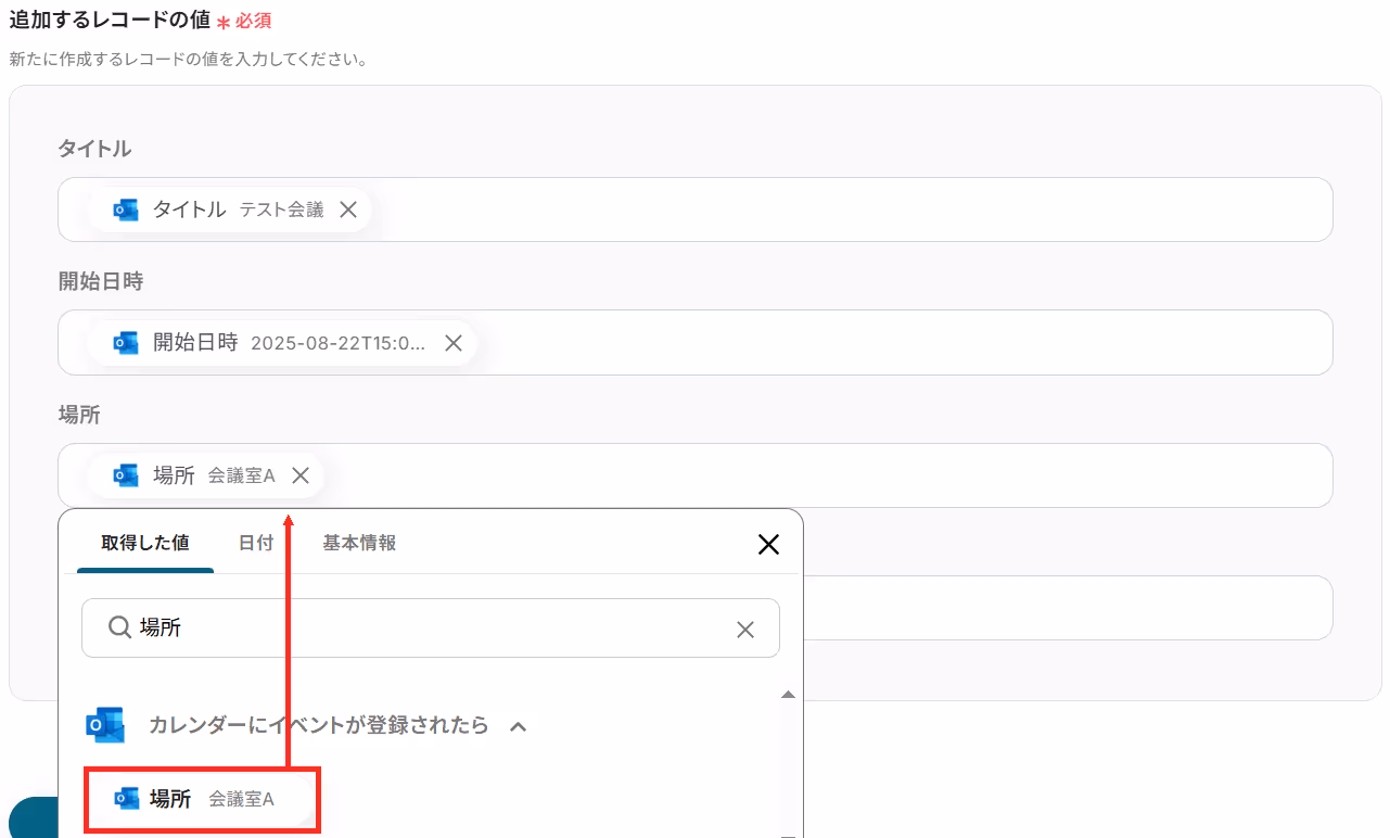 以下のようにOutlookから取得したアウトプットを選択すると、カレンダー情報を変数として反映させることができます。