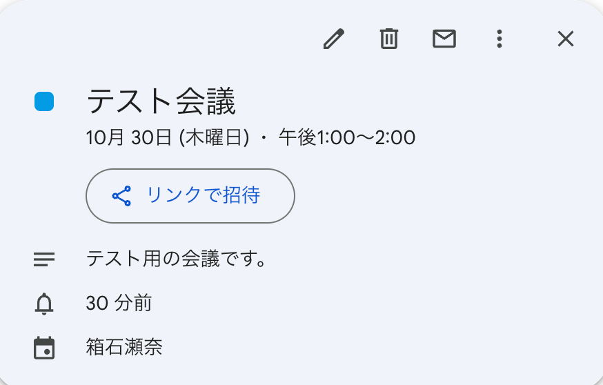 事前準備として、Googleカレンダーで予定を作成しておきましょう。 今回はテスト用に、以下の内容で作成しました。