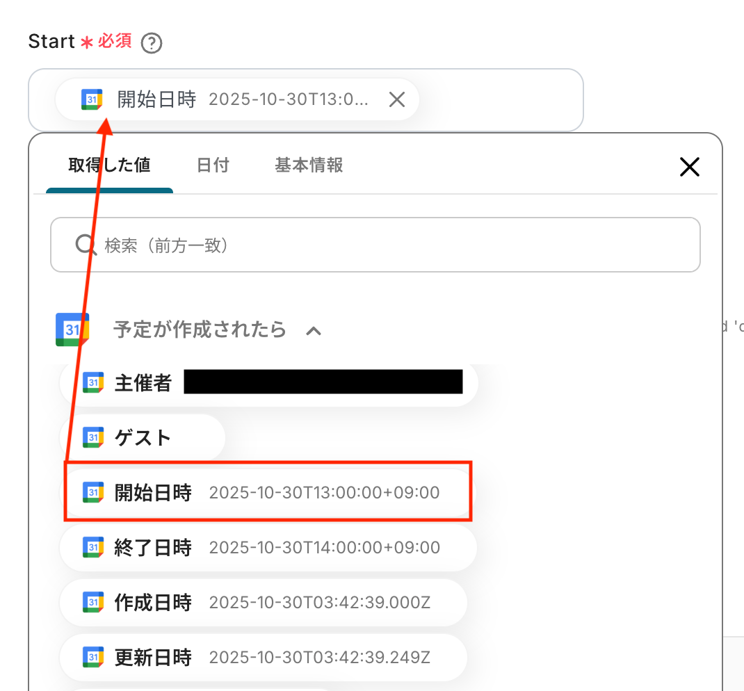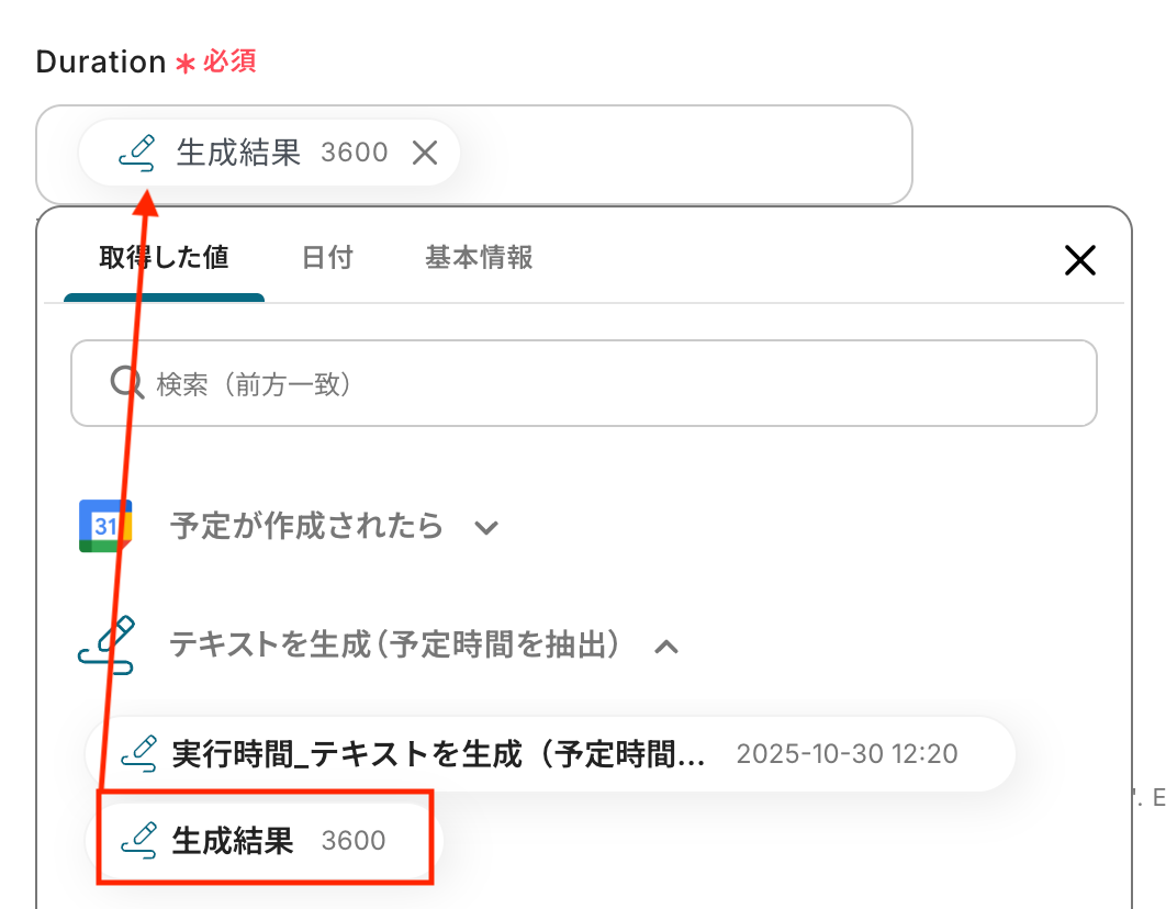 Duration Start こちらもDescriptionと同様に、入力欄をクリックすると取得した値が表示されるので選択して入力が可能です。
