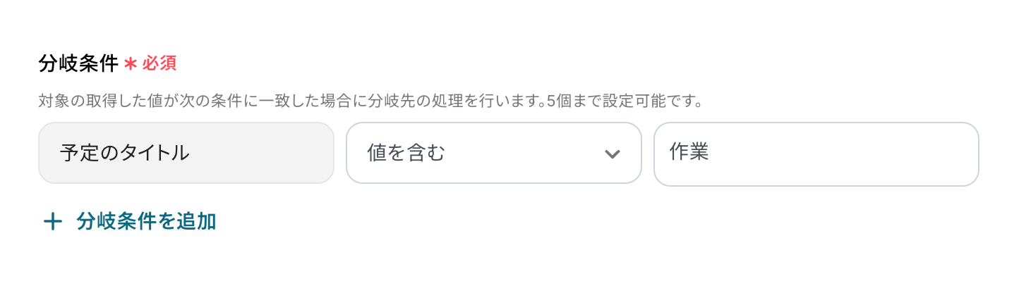 続いて、分岐条件を「予定のタイトルに作業 という値を含む場合」に設定します。