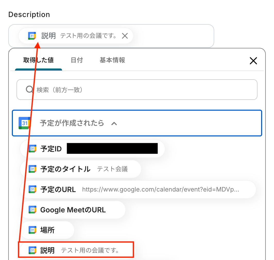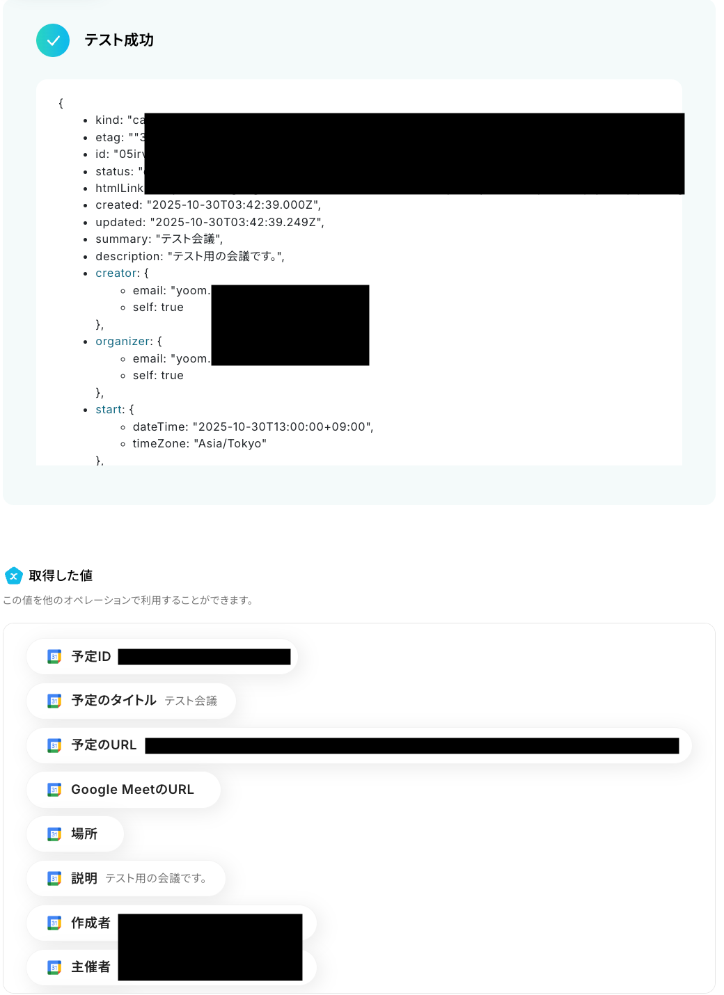 テストに成功すると、Googleカレンダーに作成された予定に関する情報が表示されます。 以下の画像の取得した値はこの後のステップで利用することが可能です。