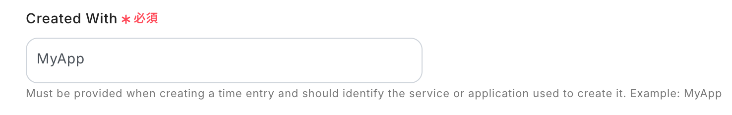 Created With Togglでは、どのサービスからTime Entryが作成されたかを示す識別名の入力が必要です。 任意の名称を設定しましょう。