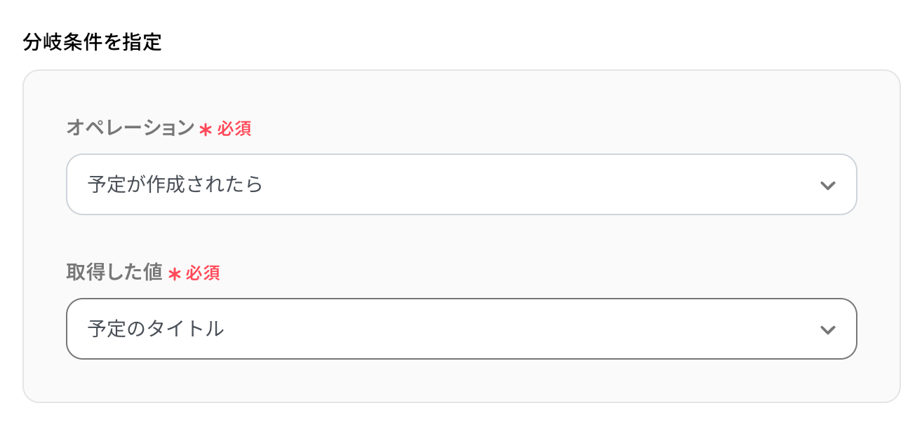 オペレーションにGoogleカレンダーのトリガーアクション「予定が作成されたら」を選択し、取得した値に「予定のタイトル」など分岐条件に用いる項目を設定します。