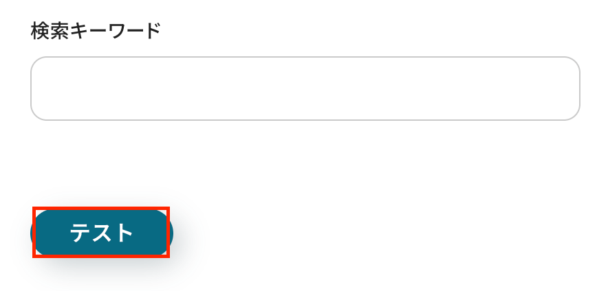 検索キーワード欄には、必要に応じて作成した予定に含まれるキーワードを設定してください。 入力が完了したら、設定内容とトリガーの動作を確認するため「テスト」をクリックします。