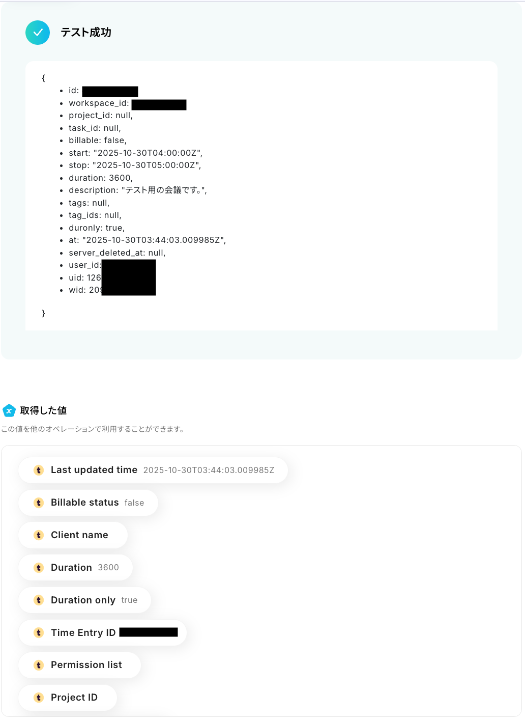 テストが成功すると、生成されたテキストが表示されます。 以下の画像の取得した値を利用して、この後のステップでTogglでTime Entryの作成が可能です。