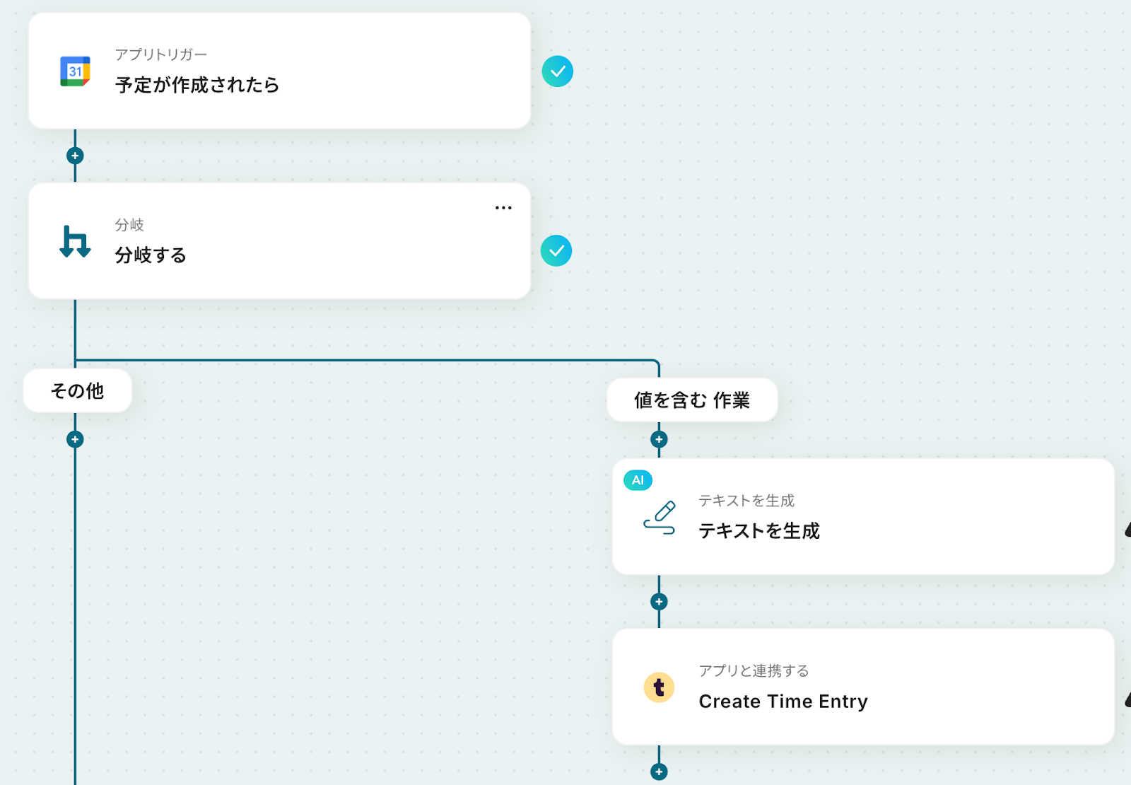 この設定により、予定のタイトルに「作業」という値を含む場合にのみ、フローボットが起動し、TogglにTime Entryが作成されるように設定できました。