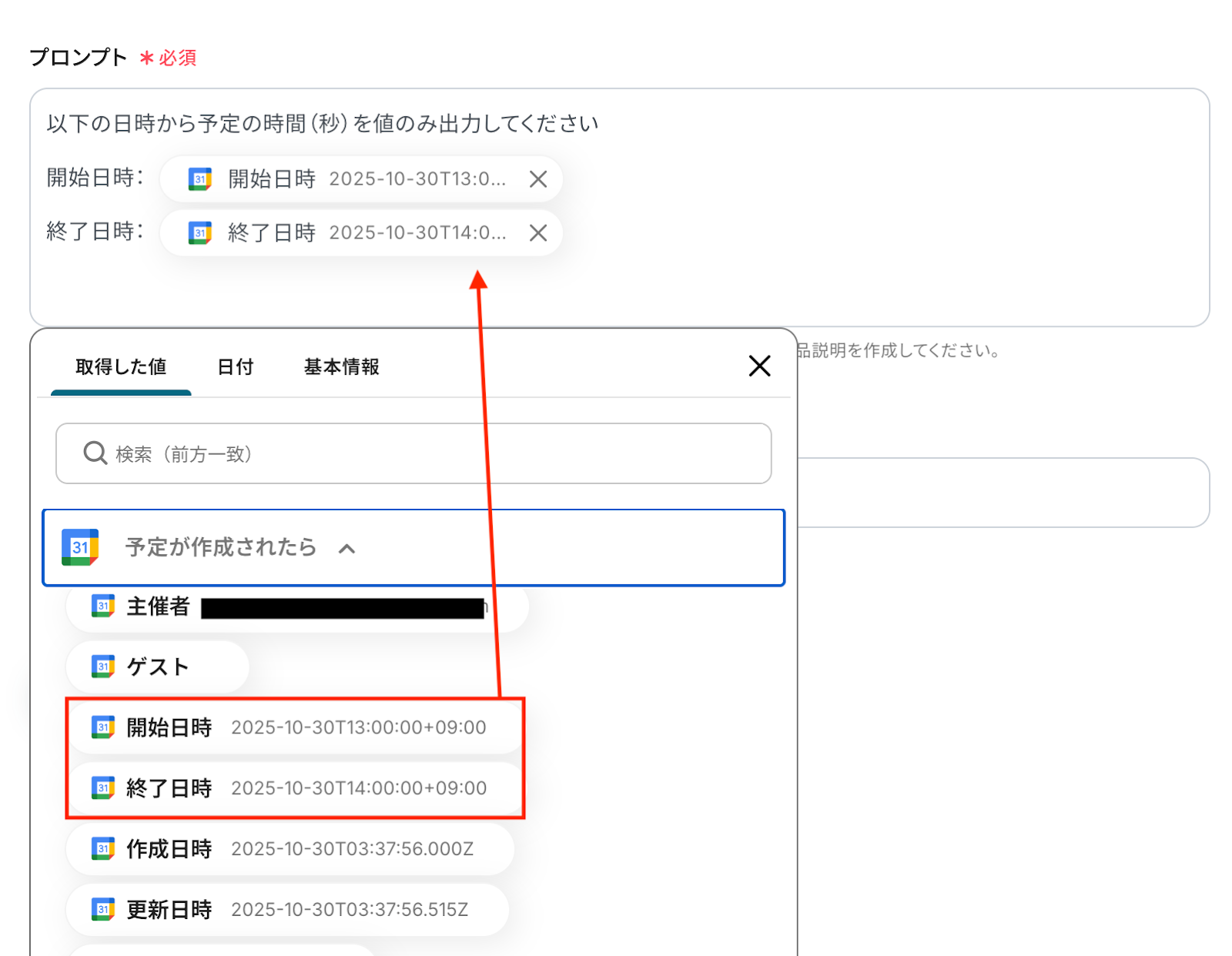 プロンプト AIに生成させたい文章の形式を指定するため、プロンプトを設定します。 入力欄をクリックすると、前のステップでGoogleカレンダーから取得した値が表示されるので、選択して入力しましょう。 取得した値を活用することで値が固定化されず、フローボットを起動するたびに最新の情報を自動で反映 できます。 なお、Togglでは予定時間を秒数で指定する必要があるため、Googleカレンダーの予定の開始・終了時間から、AIに予定時間の秒数だけを生成させるプロンプト(デフォルト)を設定しています。