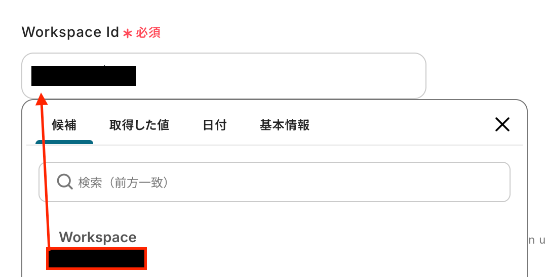 Workspace Id 入力欄をクリックするとマイアプリ連携をしたアカウントから候補が表示されるので、対象の項目を選択しましょう。
