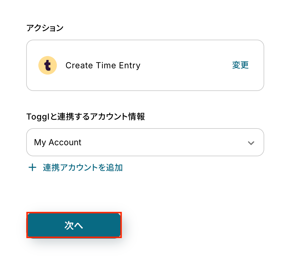 アクションはあらかじめ設定されているため、そのまま内容を確認してください。 Togglと連携するアカウント情報に問題がなければ、「次へ」をクリックします。